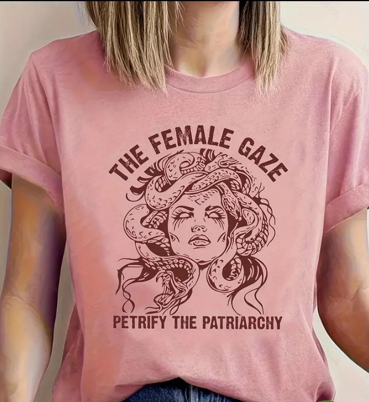 Bu tişört, Medusa'nın güçlü bakışları ve "The Female Gaze" (Kadının Bakışı) mottosuyla ataerkil düzeni taşlaştırmayı amaçlayan bir sembol sunuyor.